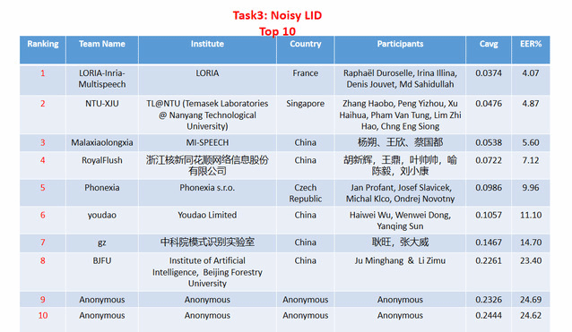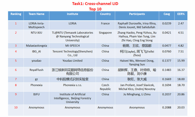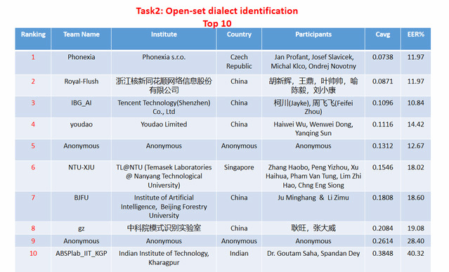 There are totally 58 teams that registered this challenge. Until the deadline of submission, 20+ teams submitted their results. The submissions have been ranked in terms of the 3 language recognition tasks respectively, one is Cross-channel LID task, the second one is Open-set dialect identification task, and the third one is Noisy LID task. We just present team information of the top 10 ones.