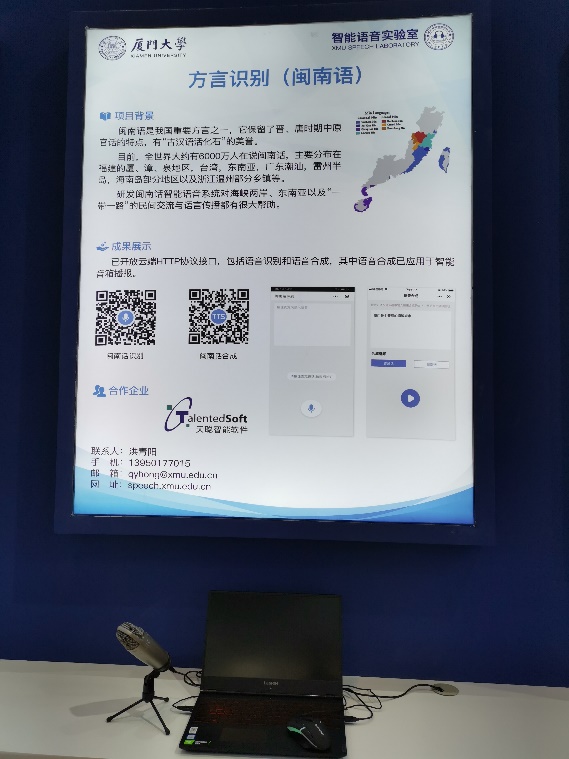 厦门大学智能语音实验室的洪青阳老师,颜婉玲和陈屹婷同学携方言识别(闽南语)和实时会议语音转写系统两大科研技术成果参与展会。