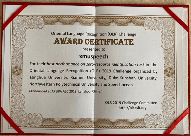 2019年11月21日在中国兰州举办的2019亚太信息与信号处理峰会(APSIPA ASC 2019)上,“东方语种识别竞赛(OLR Challenge-Oriental Language Recognition Challenge)”组织方宣布了第四届东方语种识别竞赛(OLR 2019 Challenge)的比赛结果,厦门大学智能语音团队(xmuspeech)喜获低资源语种识别任务第一名,同时还获得短语音语种识别任务第三名和跨信道语种识别任务第三名的优异成绩。这是xmuspeech团队继2018年获得OLR短语音语种识别任务第一名后,今年再获佳绩。