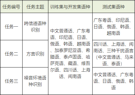 3. 竞赛内容含三个子任务:除常规的“跨信道语种识别”任务外,首次增加“方言识别”和“噪音环境中的语种识别”。