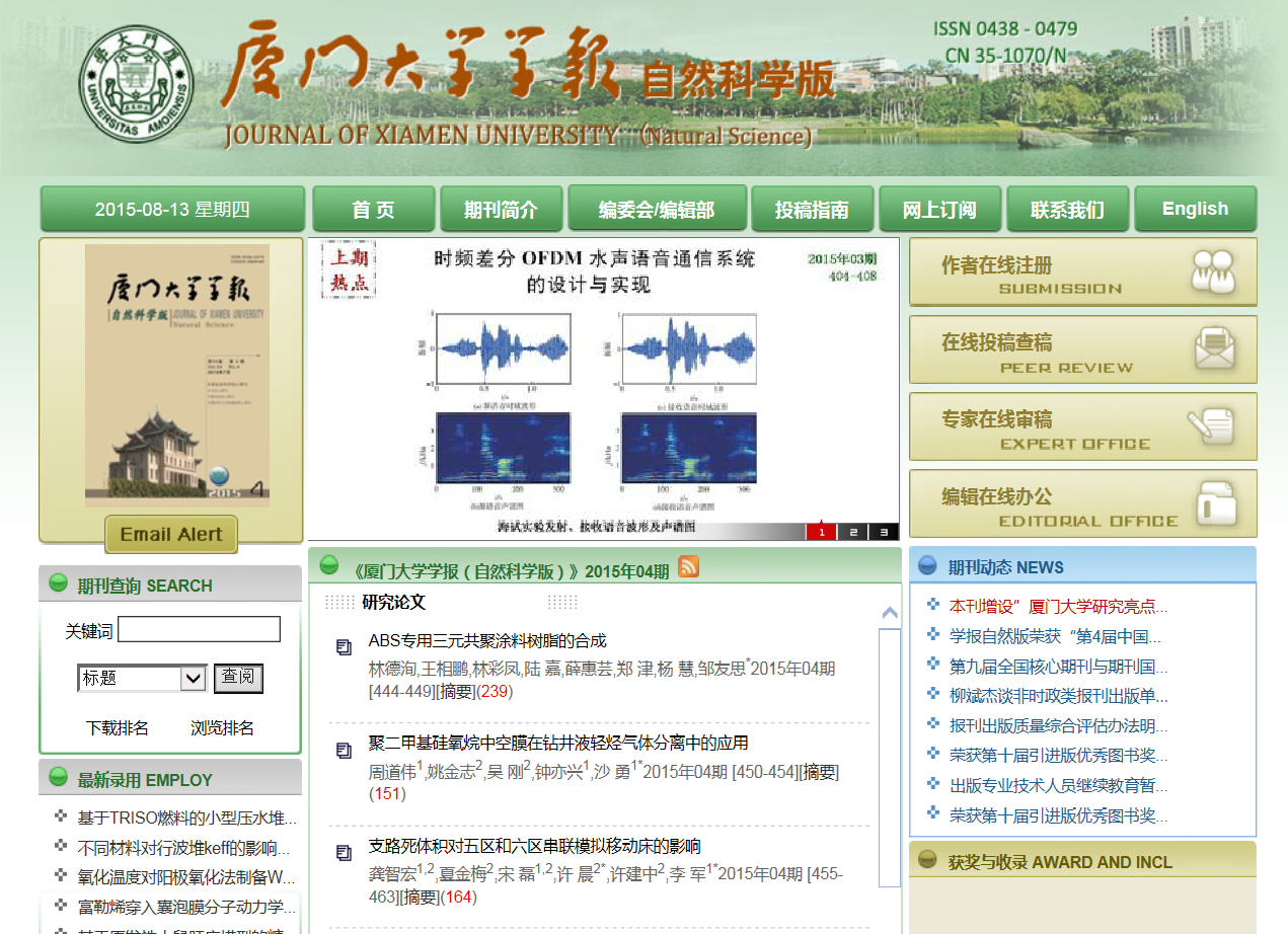 The article entitled Design and Implementation of Time Frequency Differential OFDM Underwater Voice Communication System in the Journal of Xiamen University (Natural Science)(author: ZENG Kun, ZHOU Yue-hai and Tong feng) has been listed in the Top 3 Most Read for the month of March 2015. This article proposes the system design of OFDM underwater acoustic voice communications based on floating-point DSP. The system design takes advantage of differential modulation between the time and frequency domain, to decrease the impact of varying multipath underwater acoustic channel. At-sea experiment results show the improvement of underwater acoustic communications.