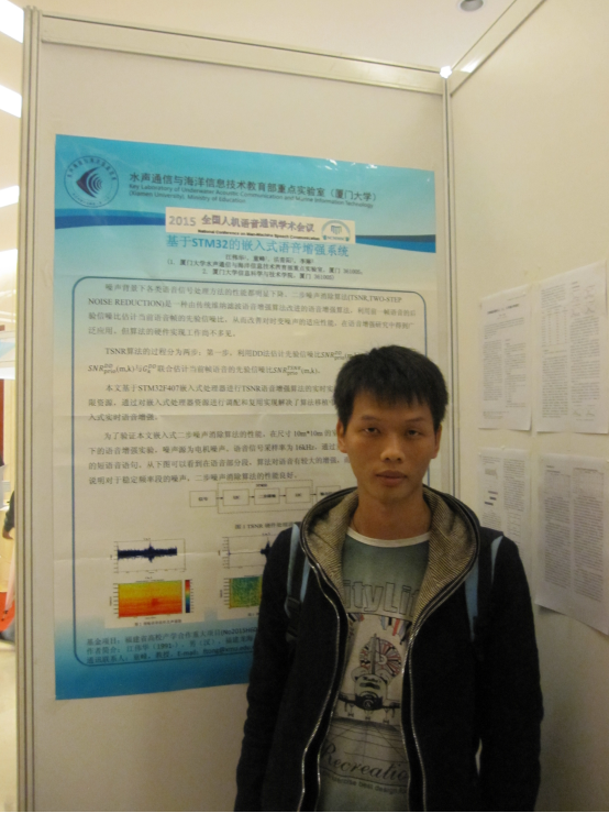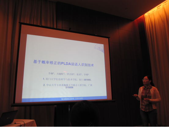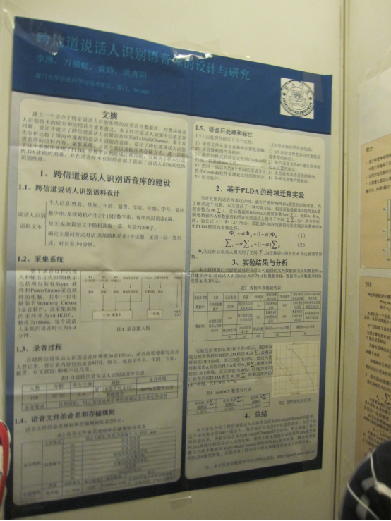 此次会议收录了我实验室三篇论文,分别是“基于概率修正PLDA的说话人识别技术”、“跨信道说话人识别语音库的设计与研究”、“Embedded Speech Enhancement System based on STM32”。其中,李琳老师做了第一篇论文的口头报告,通过精心制作的PPT展示了论文的研究背景、研究方法、实验结果和实验创新点,与大会分会场主席及各位学者进行了热烈的讨论。后两篇文章参与了10月25日下午的海报展示环节,与众多科研工作者进行面对面交流,展示与分享了实验室的研究成果。